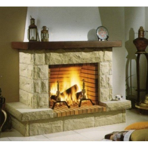 Фронтальный камин серии Stylo из песчаника Arenisca грубой обработки без шва. Центральная плита из огнеупорного кирпича толщиной 5 см. Кирпичная топа Basic.