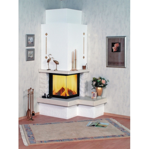 Пристенно-угловой камин Hark 11/117. Столешница, каминная полка и боковые вставки из различных видов мрамора. В комплект облицовки входят опорная рамка с крепежами, лента, клей, DVD с инструкцией по установке, бетонный цоколь (если предусмотрен), и шамотный короб с проматом (если короб конструкционно входит в облицовку). В комплект не входят дымоотводные трубы, промат для изоляции стен, гофра для подвода воздуха под облицовку. Решётки поставляются опционно.