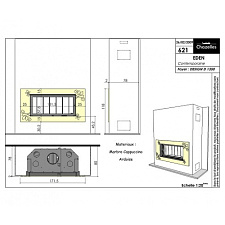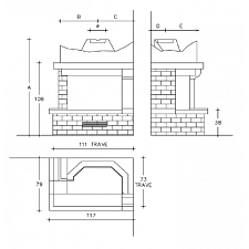 Пристенный камин изготовлен из белого мрамора. Плита под топкой выполнена из мрамора, имитирующий кирпич, в виде кирпичной кладки. Декоративная деревянная балка, на которой можно разместить небольшие предметы. Под топкой предусмотрены отверстия для доступа воздуха.