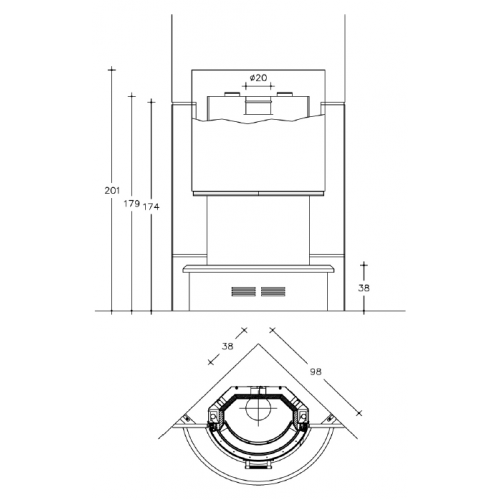 Встраиваемый камин полукруглой формы. Низ камина выполнен из мрамора. Плита под топкой - мрамор розового цвета. Кожух камина - из стали. Дверь из огнеупорного стекла. В нижней части камина предусмотрены отверстия для доступа воздуха. В качестве горючего применяются дрова. Параметры: Длина: 99 см Высота: 174 см Глубина: 99 см