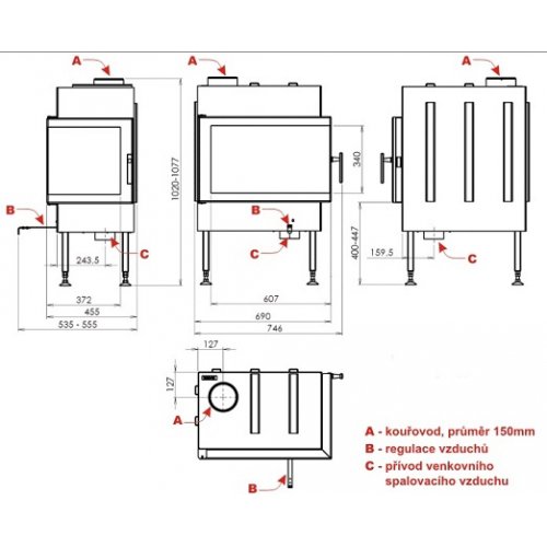 Топка Cardif снабжена винтовыми ножками, поэтому при монтаже легко выставить её строго по уровню. Под колосником установлен выдвижной зольник, из которого золу высыпают по мере его наполнения.