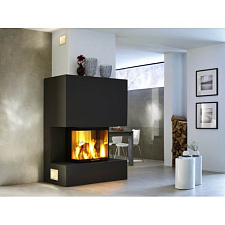 - В дверях вмонтирована жаропрочная стеклокерамика немецкой компании Shott Robax, выдерживающая температуру до 800°C. Топка укомплектована декоративным стеклом, окрашенным методом шелкографии, которое делает камин более современным и элегантным, визуально увеличивает размер камина. На лицевой стороне которого находится «воздушная подушка» препятствующая загрязнению стекла сажей.