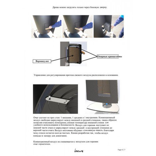 Очаг состоит из трех стен: внешней, средней и внутренней. Конвекционный воздух свободно циркулирует между внешней и средней стенками, таким образом позволяя отапливать помещение, снижая температуру внешней стенки для удобного использования и безопасности. Воздух для горения поступает из нижней части очага. Воздух постоянно обдувает стеклянную панель, благодаря чему стекло остается чистым.