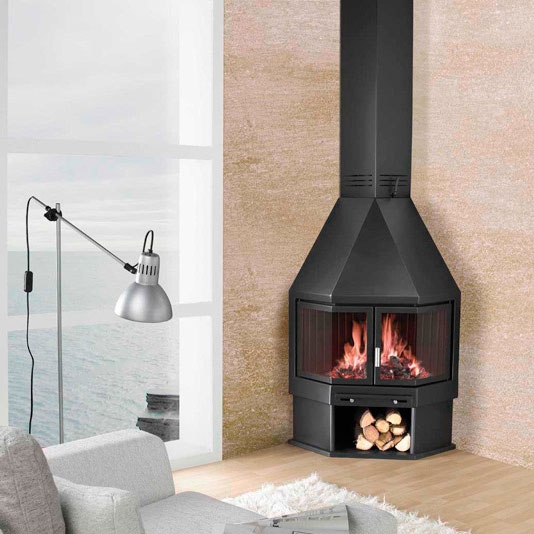 Угловой металлический камин с дверцами. Топка из толстой стали. Зольник с решеткой. Ниша для дров. Снабжен телескопическим элементом, позволяющим варьировать высоту от 2,60 до 3,10 м (от потолка до пола) и крепежом к потолку, дымоход диаметром 17,5 см.
