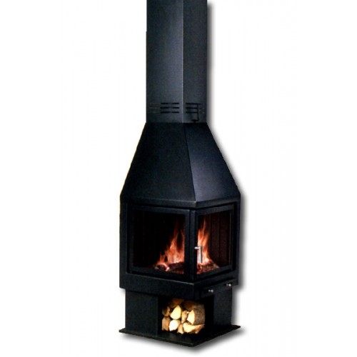 Угловой металлический камин с двойным защитным подвижным стеклом, с цоколем и встроенными дверцами. Топка из толстой стали. Зольник с решеткой встроены в нижнюю часть камина. Снабжен телескопичесим элементом, позволяющим варьировать высоту от 2,60 до 3,10 м (от потолка до пола) и крепежом к потолку, дымоход диаметром 17,5 см.