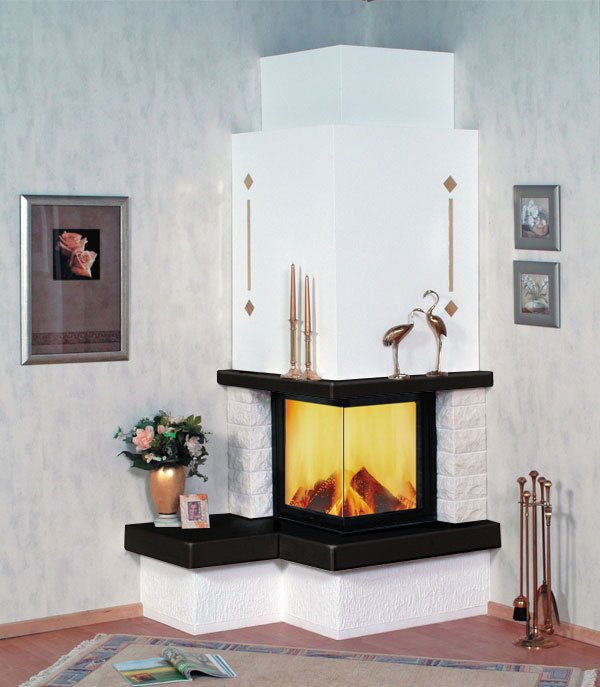 Пристенно-угловой камин. Столешница, каминная полка и боковые вставки из Granit Naturschwarz.