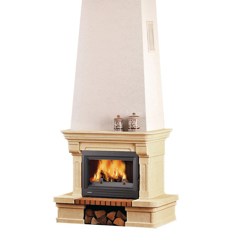 Знаменитый французский стиль «рустик». Камин из камня Edelroc® золотисто-песочного цвета + топочная плита из кирпича. Модель, устанавливаемая вплотную к стене.
