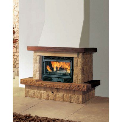 Закрытая по бокам пристенная модель, сокращенная версия. Выполнена из колотого золотистого камня, каминная плита - из желтого королевского мрамора, боковые элементы и балка - из дерева.