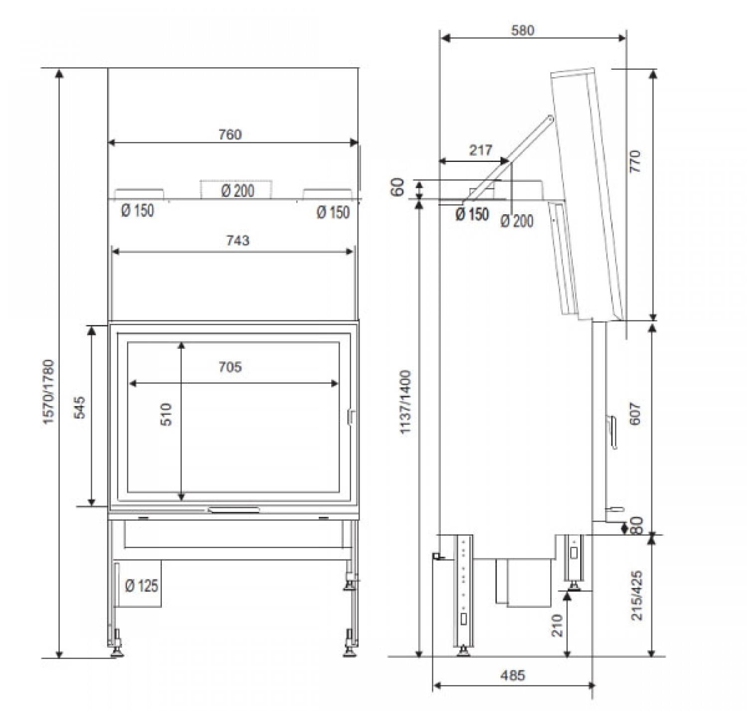 Универсальная топка изготовлена из чугуна. Плоское стекло. Подъемная дверца + боковое открывание.