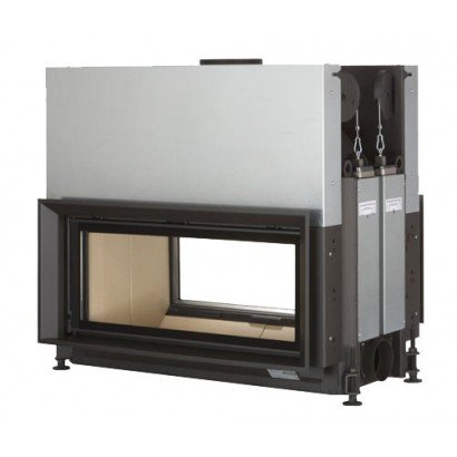 Двухсторонняя каминная топка с прямым стеклом. Топочная камера футерована шамотом. Подъёмный механизм двери (система Easy-Lift) с одной стороны. С другой стороны дверца откидывается для чистки.