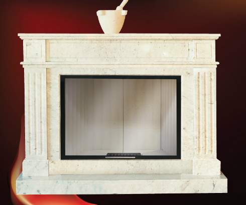 Камин с декоративными колоннами ручной работы. Классическая облицовка под закрытую топку с прямым стеклом.