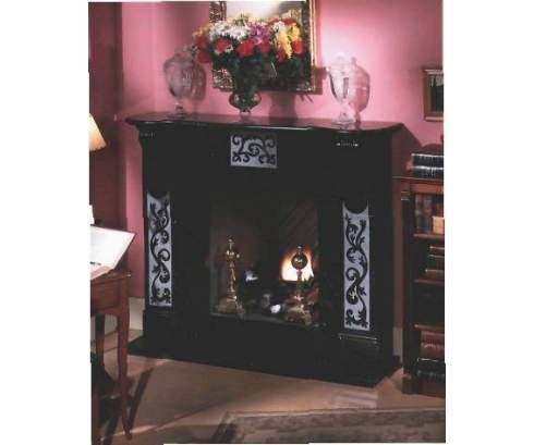 Этот необычный камин из черного мрамора смотрится эффектно и оригинально. Вставки из мрамора светлого оттенка с растительным орнаментом придают этой модели особую изюминку.