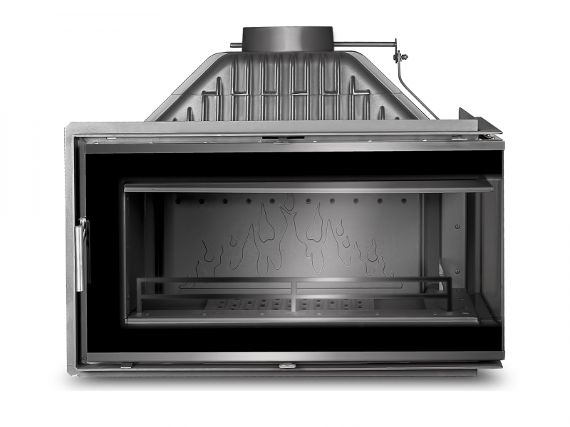 Повышенный КПД и теплоотдачу обеспечивает чугунный дефлектор, который расположен над камерой сгорания каминной топки KAWMET. Назначение дефлектора - направить недогоревшие частицы дровяного газа в центральную часть камеры сгорания, где происходит повторное догорание. Также дефлектор увеличивает тепловую эффективность топки путем удлинения пути прохождения продуктов сгорания.