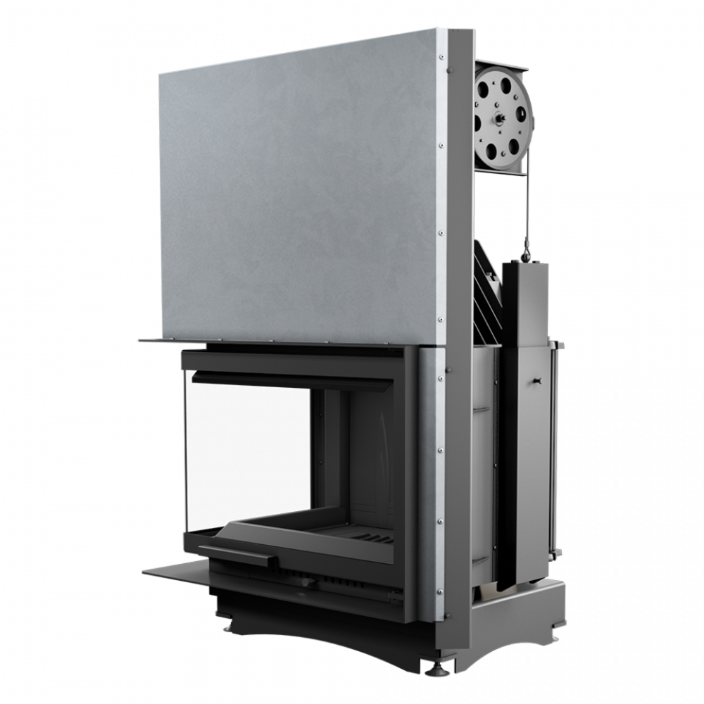 Топка имеет тросовый механизм поднятия дверцы, который при установке оказывается невидим – его закрывает облицовка камина. Большая дверца с Г-образным стеклом имеет удобную ручку, двойной замок обеспечивает плотное закрытие.