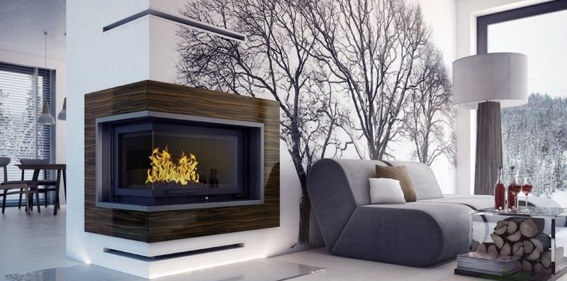 - Каминная топка с двумя стеклянными панелями, сопоставленными друг напротив друга под прямым углом (стеклянные панели соединены без рамы).