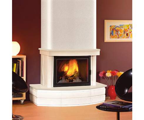 Пристенный камин в стиле модерн из золотисто-песочного или белого Эдельрока. Декорирован черным мрамором Маркина или кремовым Марфил. Камин оснащен элементами, позволяющими установить открытую или закрытую дровницу.