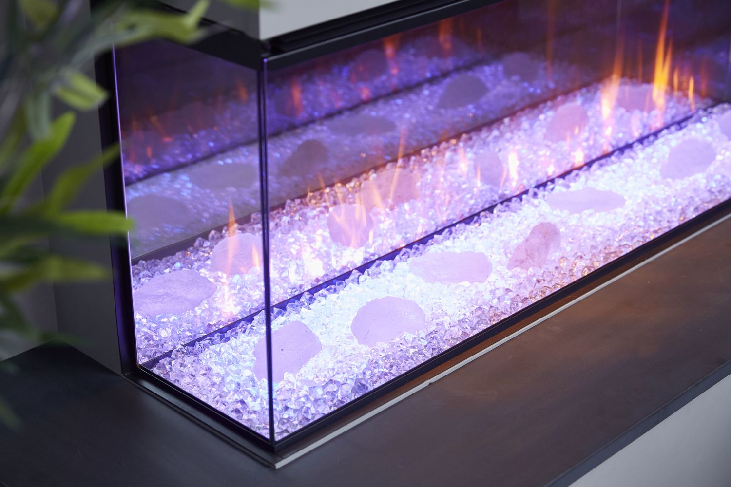 • Функция верхней подсветки: Освещает декоративные элементы (дрова и кристаллы), создавая отражение на задней зеркальной стенке, что усиливает визуальную глубину топки.