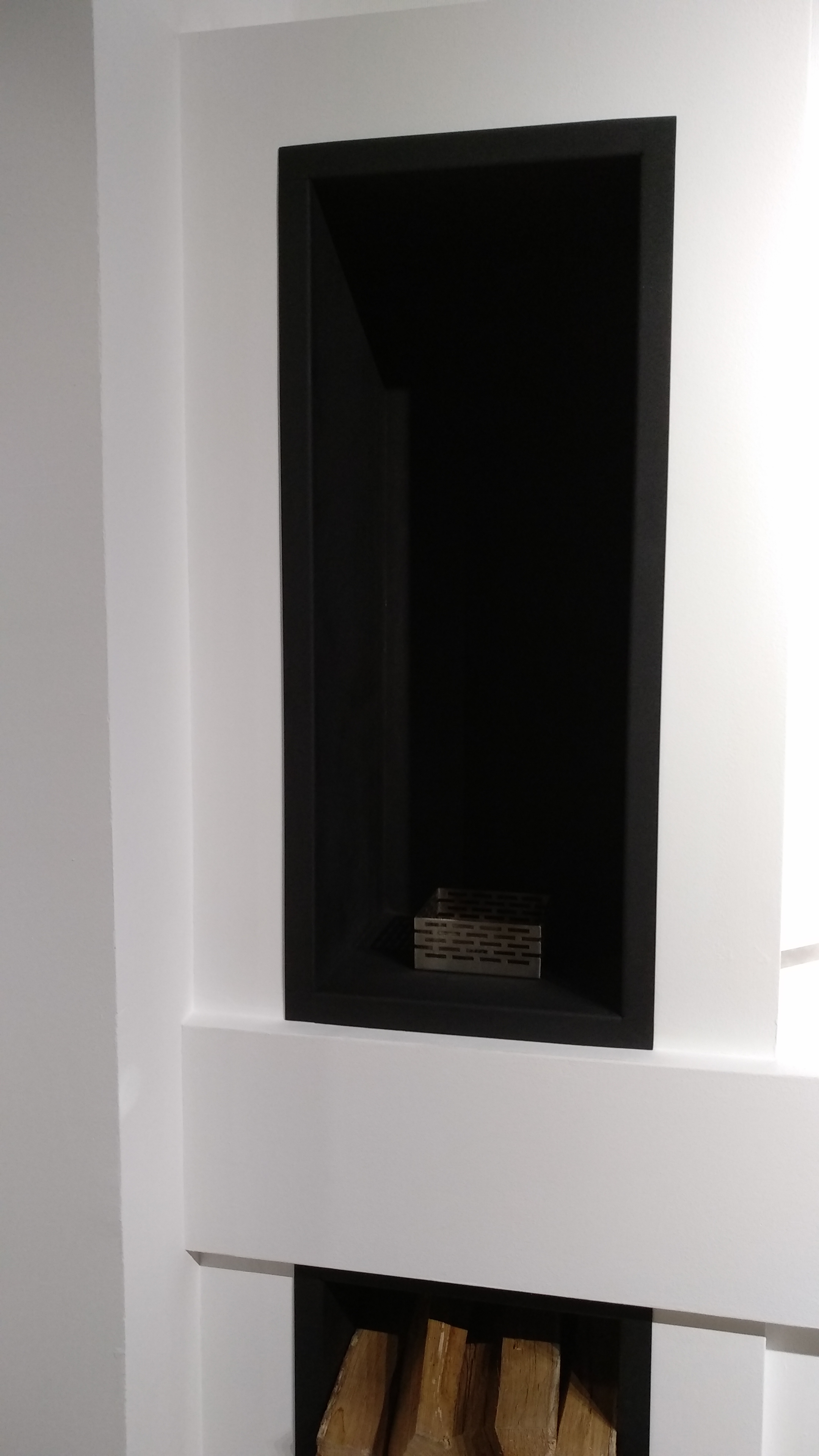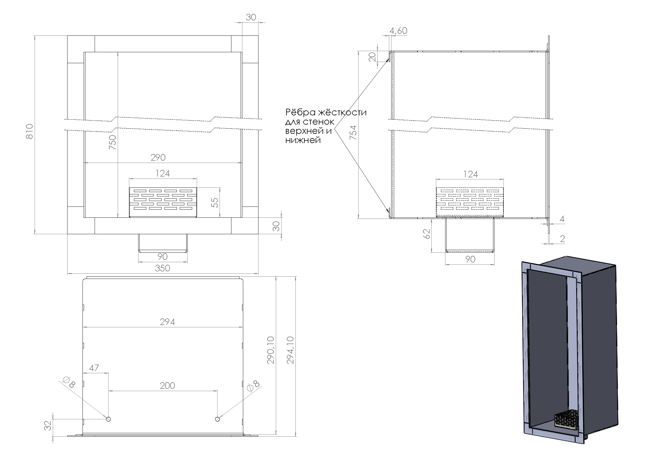 Вертикальный биокамин для нашего шоу рума и дровница с размерами ДхВхГ 350х810х290 мм. Корпус камина и дровницы из стали толщиной 2 мм, окрашены черной порошковой краской с фактурой Муар. Топливный блок с декоративной решеткой из нержавеющей стали с длинной линии огня 50 мм.
