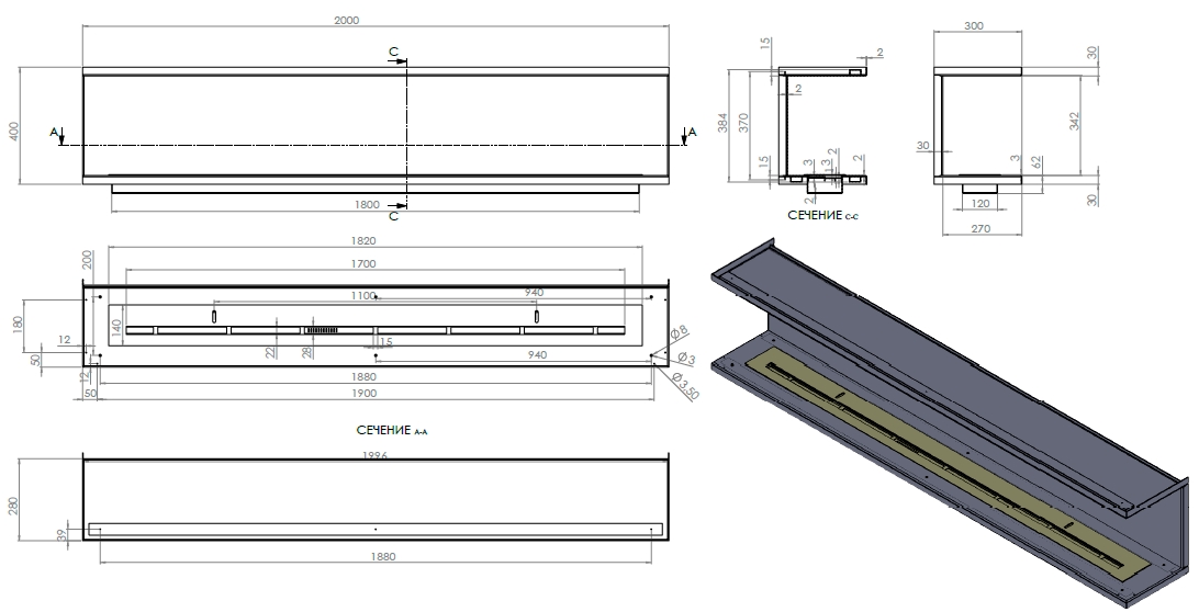 Проект №179 Торцевой биокамин длинной 2 метра