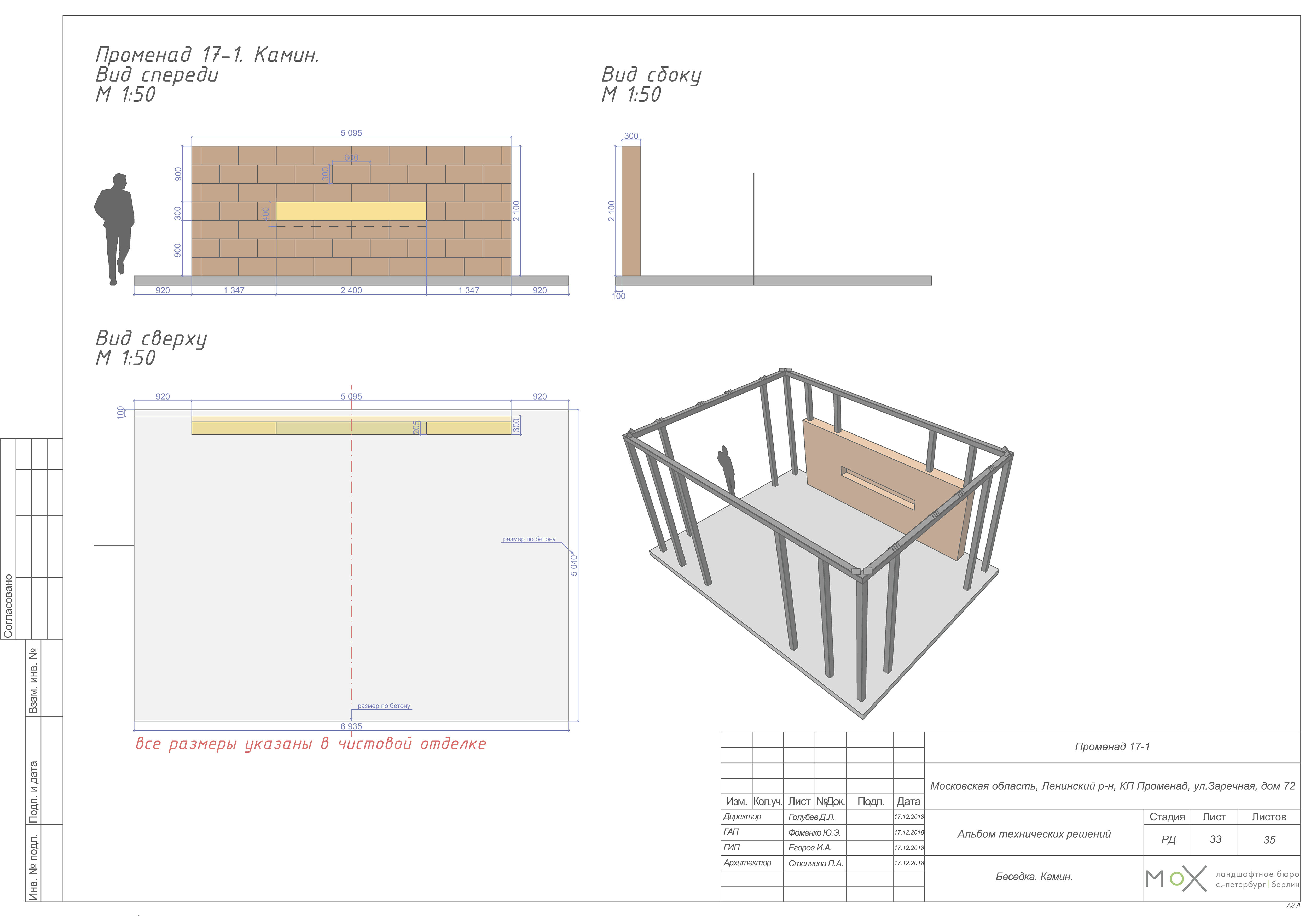 По проекту архитектора Ильи Егорова биокамин будет установлен в нише бетонной стены уличной беседки. Стена будет облицована травертином. Биокамин будет размещен на улице, поэтому при производстве камины будут использованы материалы устойчивые к изменению погодных условий.