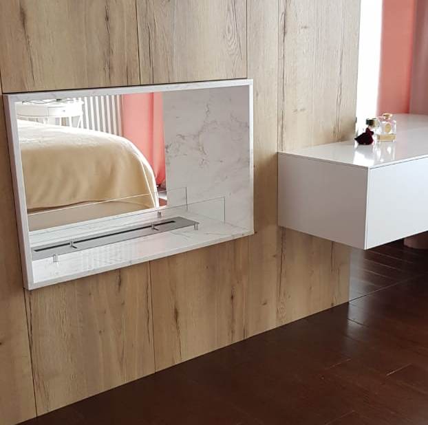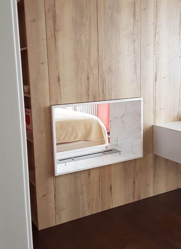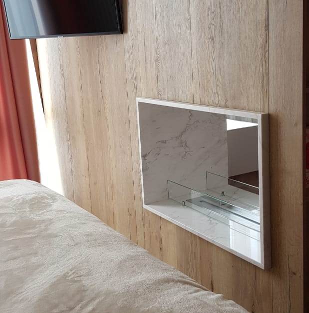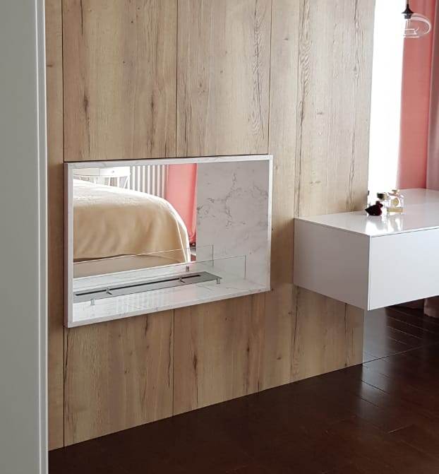 Сквозной биокамин из мрамора был установлен между спальней и гостиной в квартире в центре Москвы. Мрамор толщина 20мм. Цвет Бьянко. Под мрамор внутри ниши стены делалась специальная несущая подставка из металла для жесткости конструкции. Дополнительно установлены защитные закаленные стекла