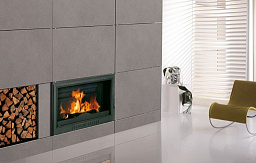 На фото представлена облицовка в цвете Rosso Lava с дровяной топкой HT 600.